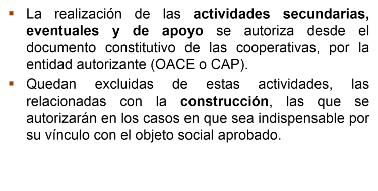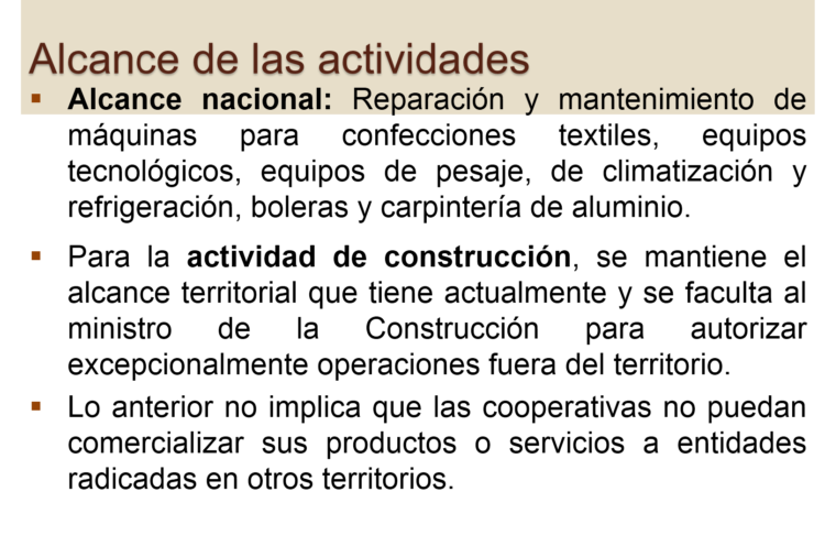 Entre los aspectos más relevantes contenidos en las nuevas normas se encuentran conceptos y principios: las cooperativas no agropecuarias son cooperativas de trabajo, donde los socios tienen como principal contribución su trabajo personal.