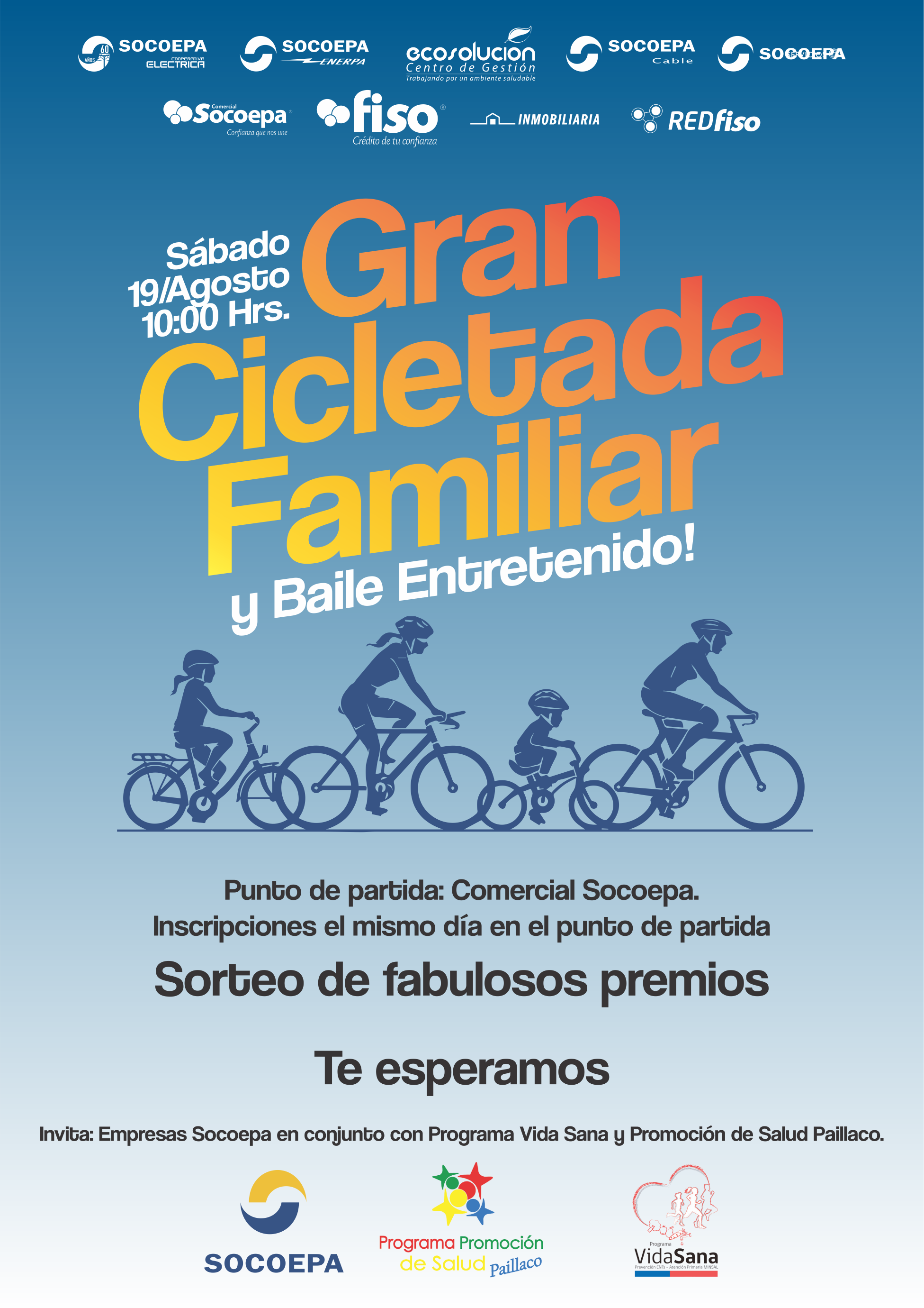 Finalmente Jorge Vergara, gerente general del Grupo SOCOEPA, explicó que “como grupo de empresas buscamos ser un actor relevante para el progreso comunal y regional del país, y para esto, fomentar la vida sana y el deporte es clave en el desarrollo integral de las personas. Por esto, invitamos a todas las familias de la zona a que nos acompañen este 19 de agosto en esta gran cicletada, donde además tendremos premios y sorpresas. Los esperamos.”