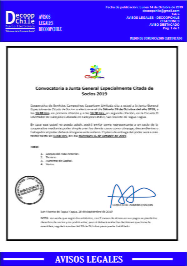 Se cita a Junta General de Socios Cooperativa Coagricom, que se llevará a cabo el próximo 19 de Octubre