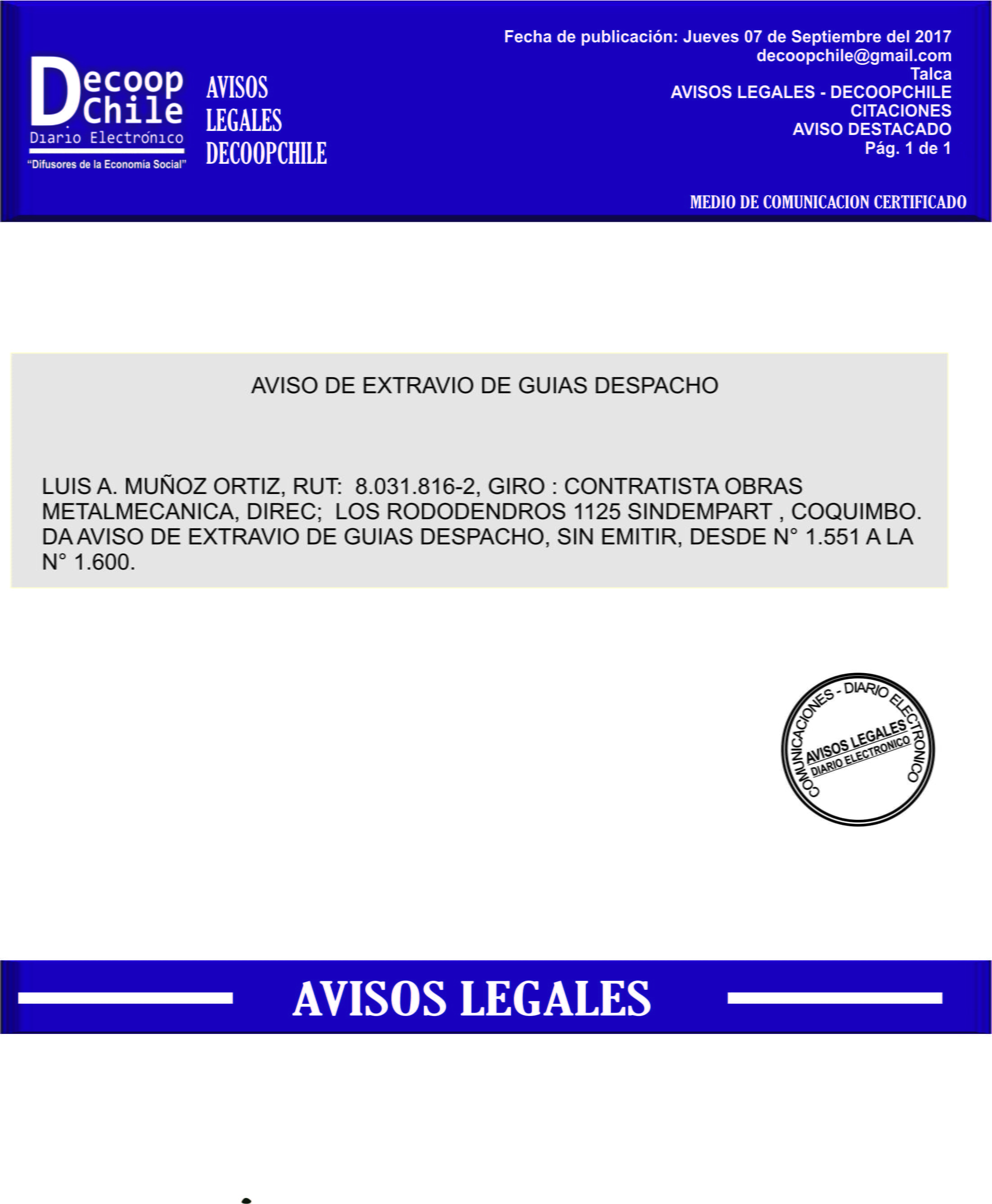LUIS A. MUÑOZ ORTIZ: DA AVISO DE EXTRAVIO DE GUIAS DESPACHO