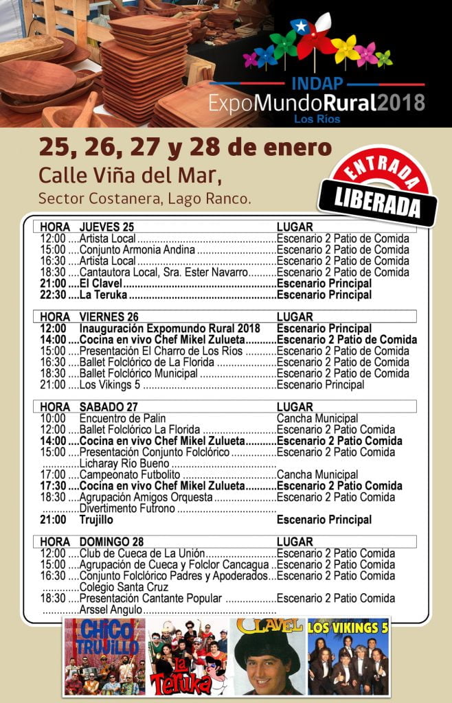 La parrilla artística de la fiesta campesina contempla números folclóricos y de artistas populares, como el Club de Cueca de La Unión, El Charro de Los Ríos, el conjunto Armonía Andina, entre otros. Los platos fuertes son El Clavel y La Teruka (jueves a las 21 horas), Los Vikings 5 (viernes a las 21 horas) y Chico Trujillo (sábado a las 21 horas).