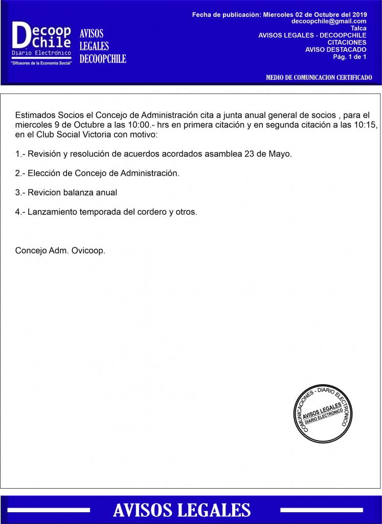 Se cita a Junta General de Socios Cooperativa Ovicoop, que se llevara a cabo el próximo 09 de octubre de 2019