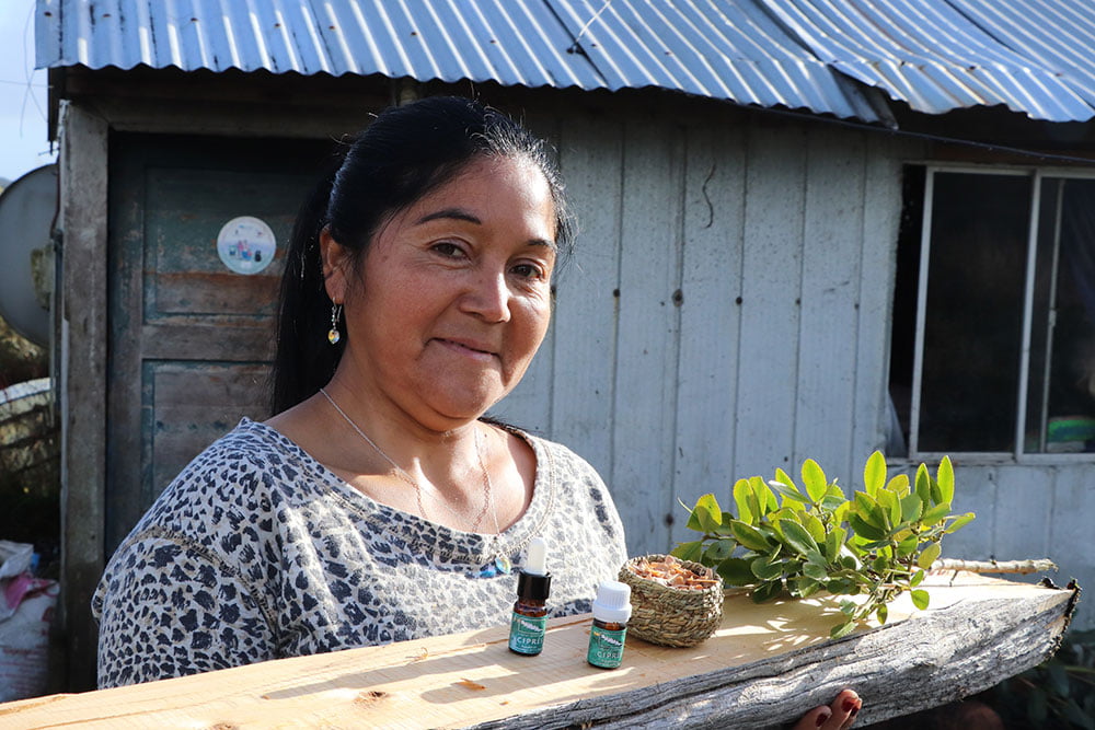 Cecilia Leviñanco es de Repollal Alto, Melinka, y desde hace un tiempo atrás se dedica a la extracción de aceites esenciales de tepa, canelo, pero principalmente de ciprés de las Guaitecas, oficio que aprendió tras haber participado en un proyecto inserto en el “Programa FNDR de Dendroenergía y Productos Forestales no Madereros”, financiado por el Gobierno Regional de Aysén y su Consejo, e implementado por Indap, lo que le permitió no solo aprender este nuevo rubro, sino también adquirir la implementación necesaria para iniciar su emprendimiento.